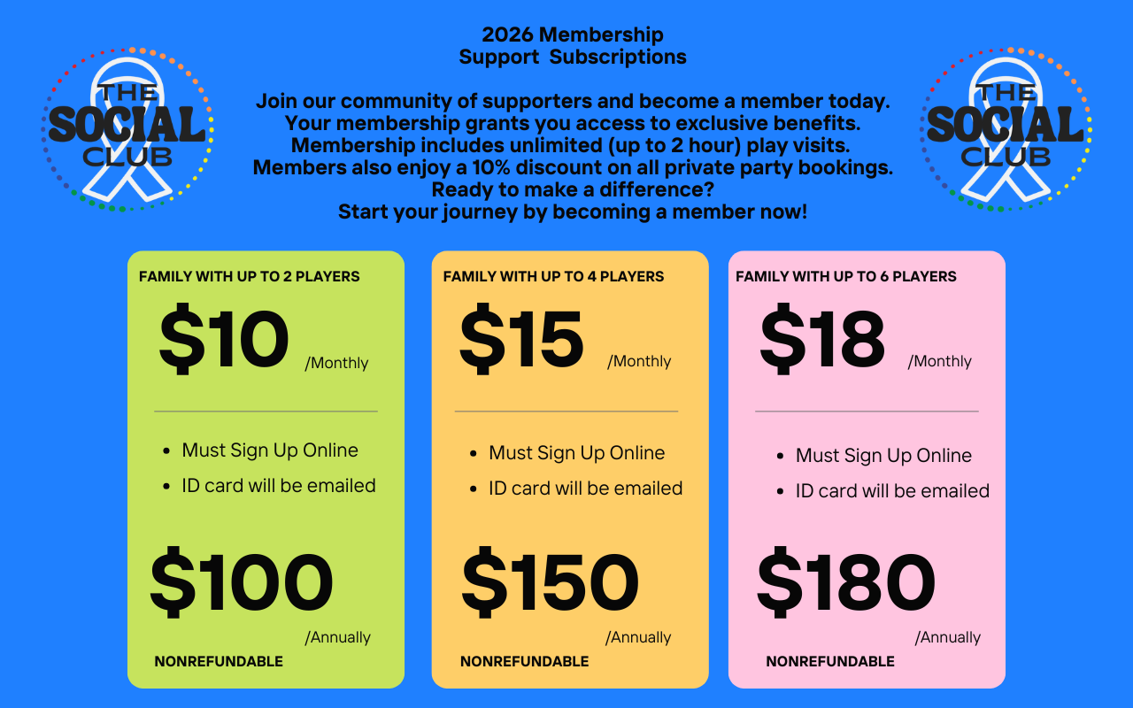 Membership includes unlimited (up to 2 hour) play visits. Members also enjoy a 10% discount on all private party bookings.